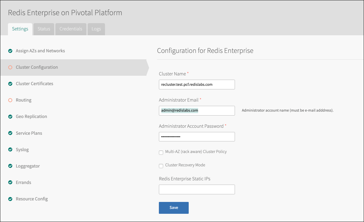 Note:Redis Enterprise for VMware Tanzu enforces minimum hardware specification requirements for Redis Enterprise. For more information, see the minimum hardware specifications in the Redis Enterprise documentation.Click Save.